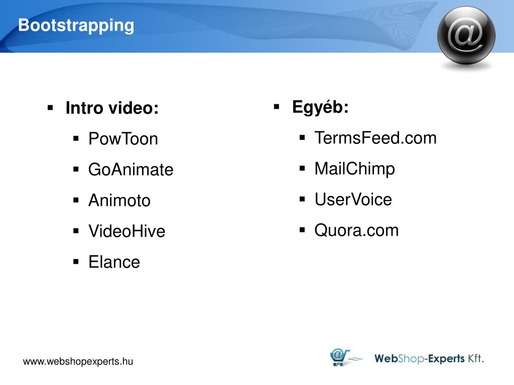 Bootstrapping • Egyéb: • TermsFeed.com • MailChimp • UserVoice • Quora.com • Intro video: • PowToon • GoAnimate • Animoto • VideoHive • Elance