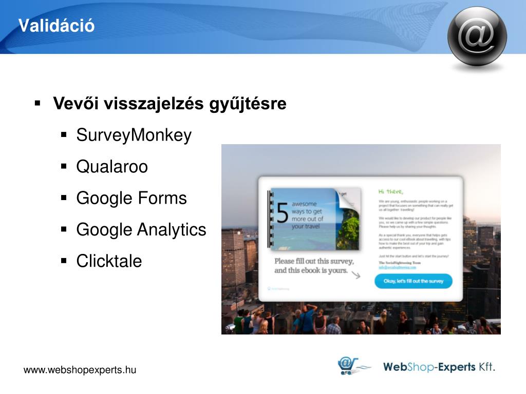 Validáció • Vevői visszajelzés gyűjtésre • SurveyMonkey • Qualaroo • Google Forms • Google Analytics • Clicktale