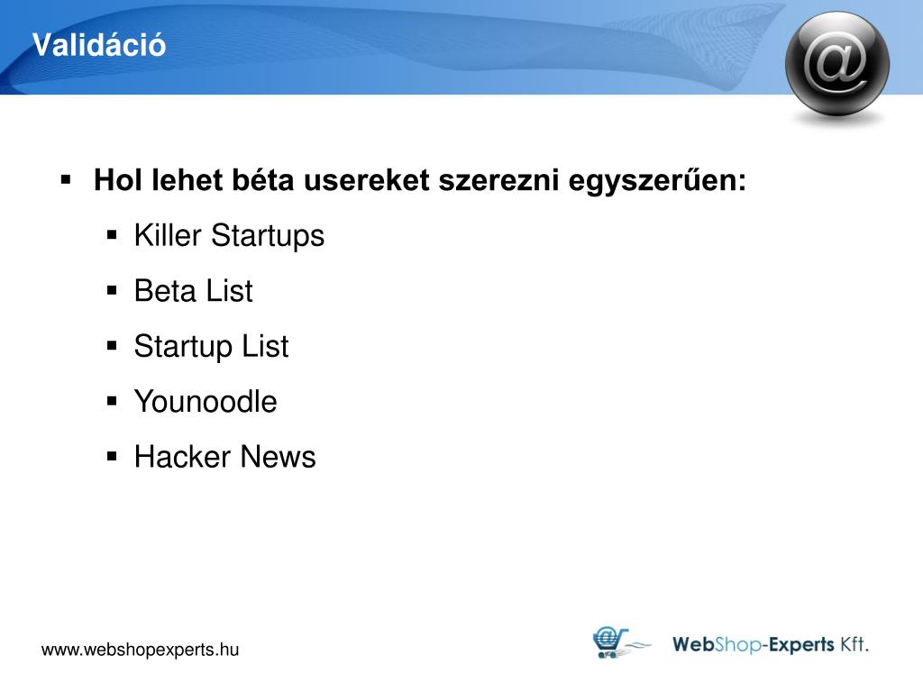 Validáció • Hol lehet béta usereket szerezni egyszerűen: • Killer Startups • Beta List • Startup List • Younoodle • Hacker News