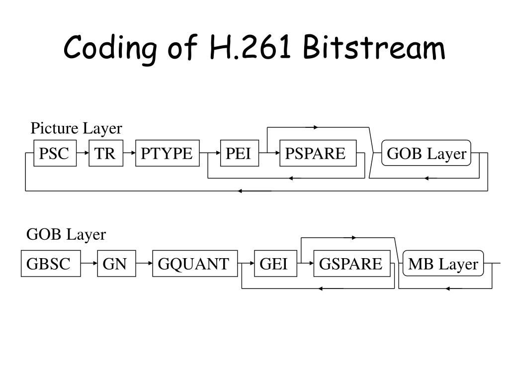 GOB Layer Coding of H.261 Bitstream Picture Layer PSC TR PTYPE PEI PSPARE GOB Layer GBSC GN GQUANT GEI GSPARE MB Layer