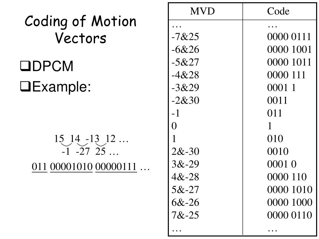 MVD Code … … -7&25 0000 0111 -6&26 0000 1001 -5&27 0000 1011 -4&28 0000 111 -3&29 0001 1 -2&30 0011 -1 011 0 1 1 010 2&-30 0010 3&-29 0001 0 4&-28 0000 110 5&-27 0000 1010 6&-26 0000 1000 7&-25 0000 0110 … … Coding of Motion Vectors • DPCM • Example: • 14 -13 12 … • -1 -27 25 … 0110000101000000111 …