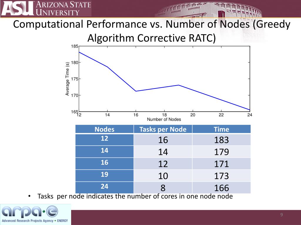 Computational Performance vs. Number of Nodes (Greedy Algorithm Corrective RATC) • Tasks per node indicates the number of cores in one node node