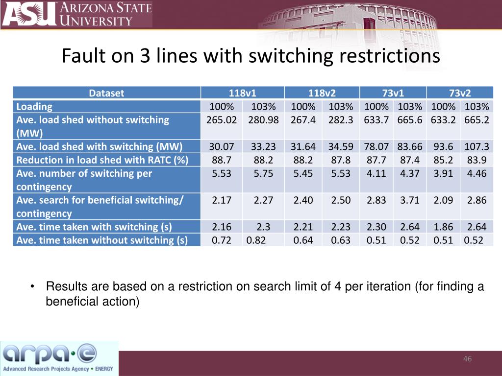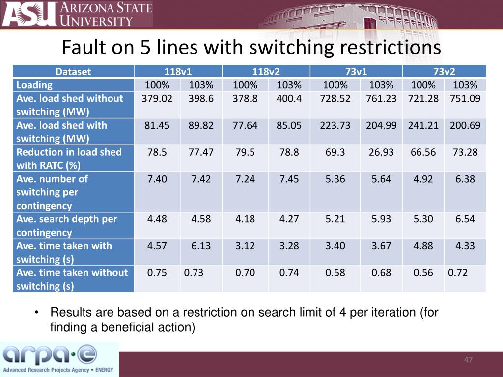 Fault on 5 lines with switching restrictions • Results are based on a restriction on search limit of 4per iteration (for finding a beneficial action)