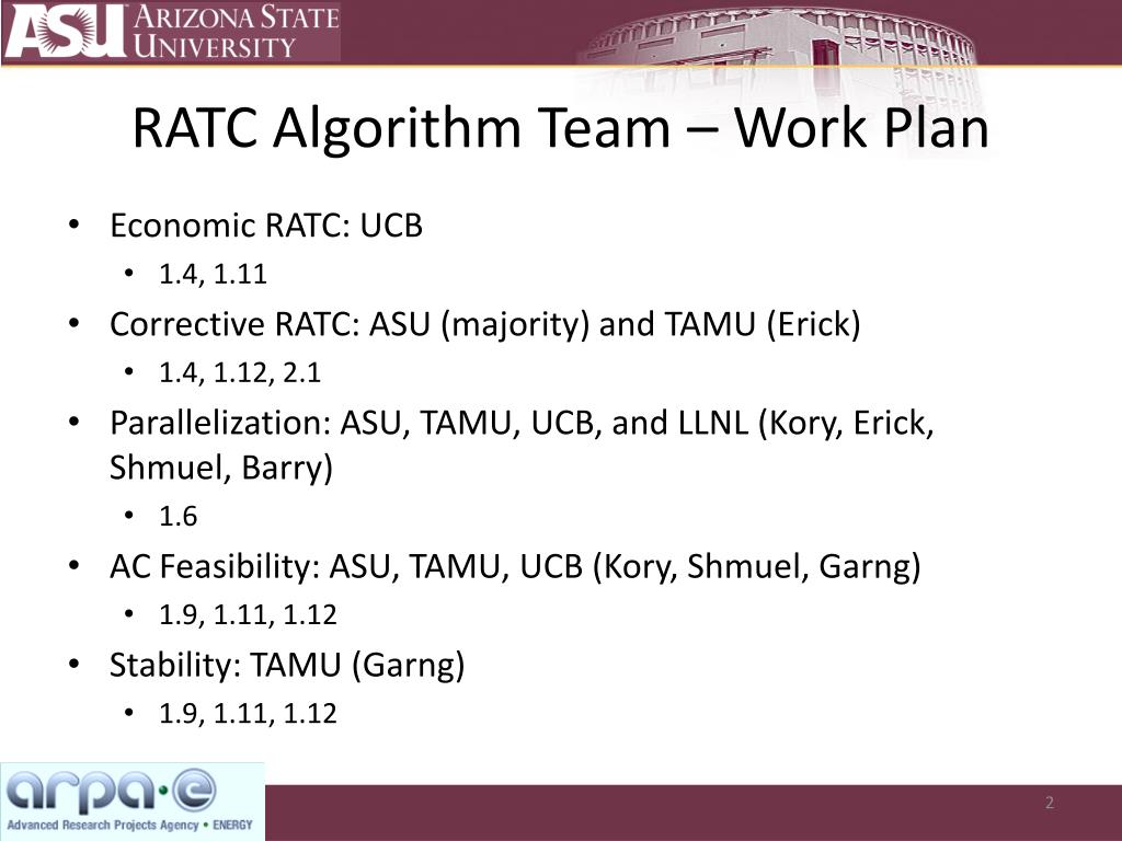 Robust Adaptive Topology Control ARPA-E Quarter 4 Review May 23, 2013. RATC Algorithm Team – Work Plan. Economic RATC: UCB 1.4, 1.11 Corrective RATC: ASU (majority) and TAMU (Erick) 1.4, 1.12, 2.1 Parallelization: ASU, TAMU, UCB, and LLNL (Kory, Erick, Shmuel, Barry) 1.6