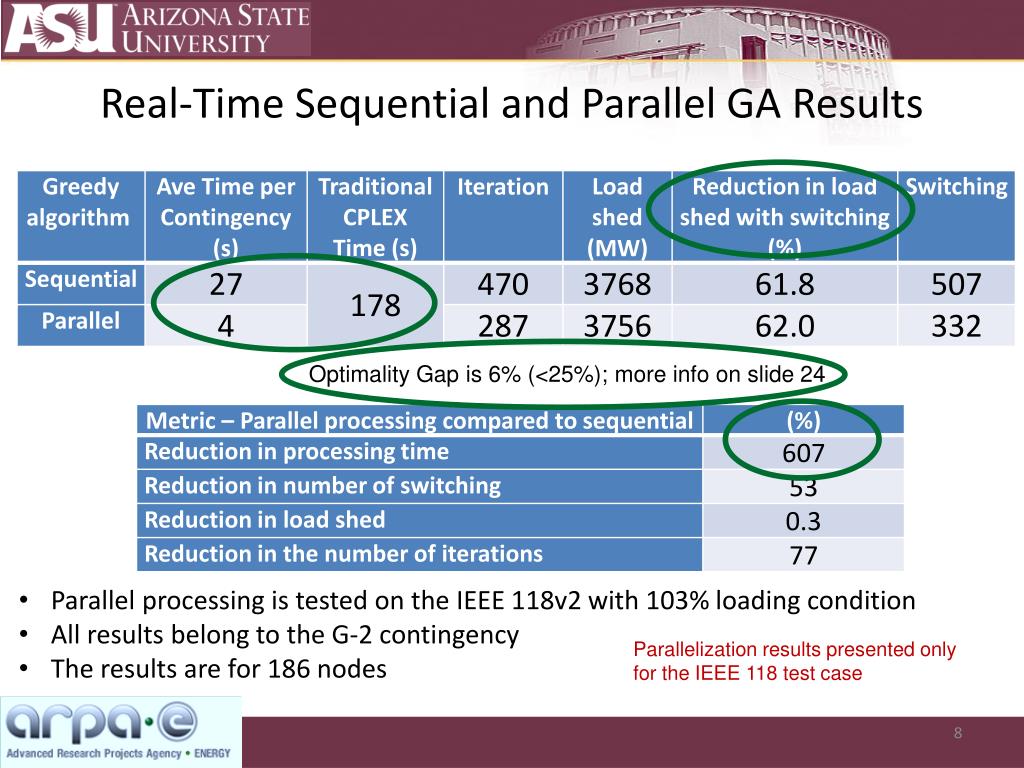 Real-Time Sequential and Parallel GA Results Optimality Gap is 6% (<25%); more info on slide 24 • Parallel processing is tested on the IEEE 118v2 with 103% loading condition • All results belong to the G-2 contingency • The results are for 186 nodes Parallelization results presented only for the IEEE 118 test case