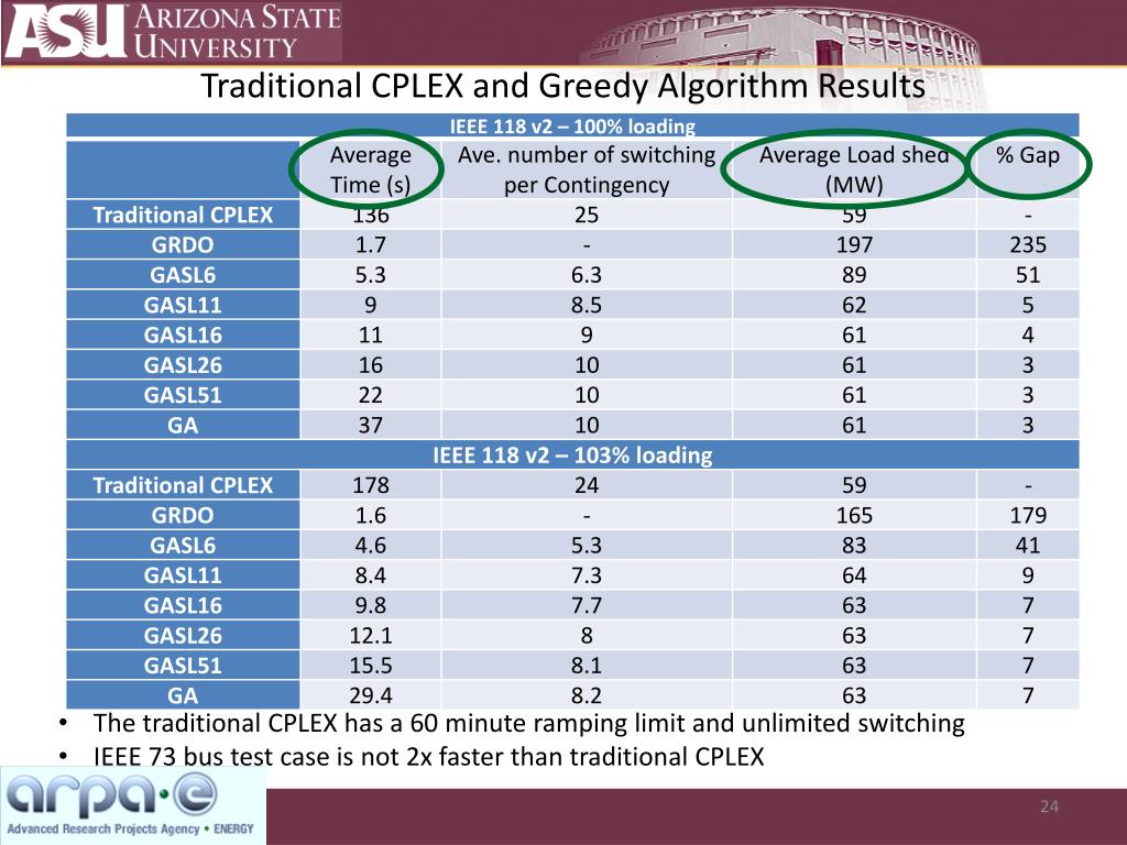 Traditional CPLEX and Greedy Algorithm Results • The traditional CPLEX has a 60 minute ramping limit and unlimited switching • IEEE 73 bus test case is not 2x faster than traditional CPLEX