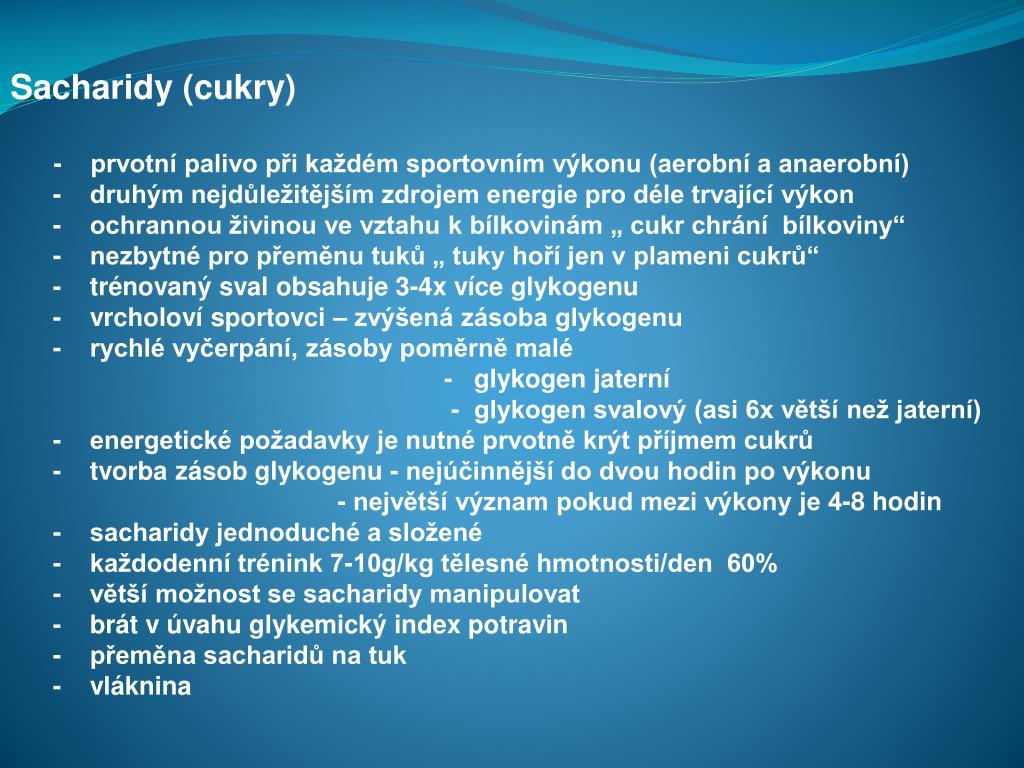 Sacharidy (cukry) - prvotní palivo při každém sportovním výkonu (aerobní a anaerobní) - druhým nejdůležitějším zdrojem energie pro déle trvající výkon - ochrannou živinou ve vztahu k bílkovinám „ cukr chrání bílkoviny“ - nezbytné pro přeměnu tuků „ tuky hoří jen v plameni cukrů“ - trénovaný sval obsahuje 3-4x více glykogenu - vrcholoví sportovci – zvýšená zásoba glykogenu - rychlé vyčerpání, zásoby poměrně malé - glykogen jaterní - glykogen svalový (asi 6x větší než jaterní) - energetické požadavky je nutné prvotně krýt příjmem cukrů - tvorba zásob glykogenu - nejúčinnější do dvou hodin po výkonu - největší význam pokud mezi výkony je 4-8 hodin - sacharidy jednoduché a složené - každodenní trénink 7-10g/kg tělesné hmotnosti/den 60% - větší možnost se sacharidy manipulovat - brát v úvahu glykemický index potravin - přeměna sacharidů na tuk - vláknina