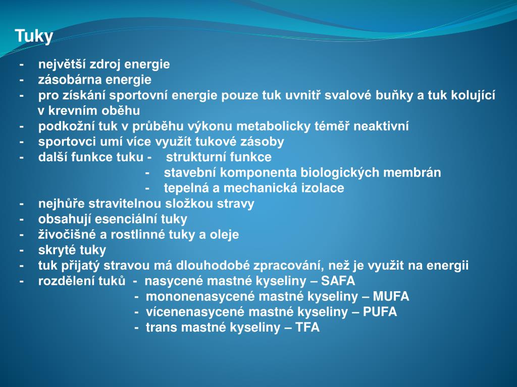 Tuky • - největší zdroj energie • - zásobárna energie • - pro získání sportovní energie pouze tuk uvnitř svalové buňky a tuk kolující • v krevním oběhu • - podkožní tuk v průběhu výkonu metabolicky téměř neaktivní • - sportovci umí více využít tukové zásoby • - další funkce tuku - strukturní funkce • - stavební komponenta biologických membrán • - tepelná a mechanická izolace • - nejhůře stravitelnou složkou stravy • - obsahují esenciální tuky • - živočišné a rostlinné tuky a oleje • - skryté tuky • - tuk přijatý stravou má dlouhodobé zpracování, než je využit na energii • - rozdělení tuků - nasycené mastné kyseliny – SAFA • - mononenasycené mastné kyseliny – MUFA • - vícenenasycené mastné kyseliny – PUFA • - trans mastné kyseliny – TFA