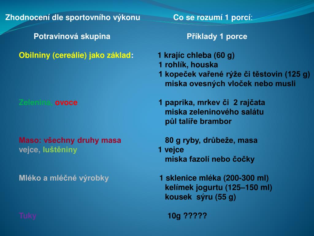 Zhodnocení dle sportovního výkonuCo se rozumí 1 porcí: • Potravinová skupinaPříklady 1 porce • Obilniny (cereálie) jako základ: 1 krajíc chleba (60 g) 1 rohlík, houska 1 kopeček vařené rýže či těstovin (125 g) miska ovesných vloček nebo musli • Zelenina,ovoce1 paprika, mrkev či 2 rajčata miska zeleninového salátu půl talíře brambor • Maso: všechny druhy masa 80 g ryby, drůbeže, masavejce,luštěniny1 vejcemiska fazolí nebo čočky • Mléko a mléčné výrobky 1 sklenice mléka (200-300 ml)kelímek jogurtu (125–150 ml)kousek sýru (55 g) • Tuky 10g ?????
