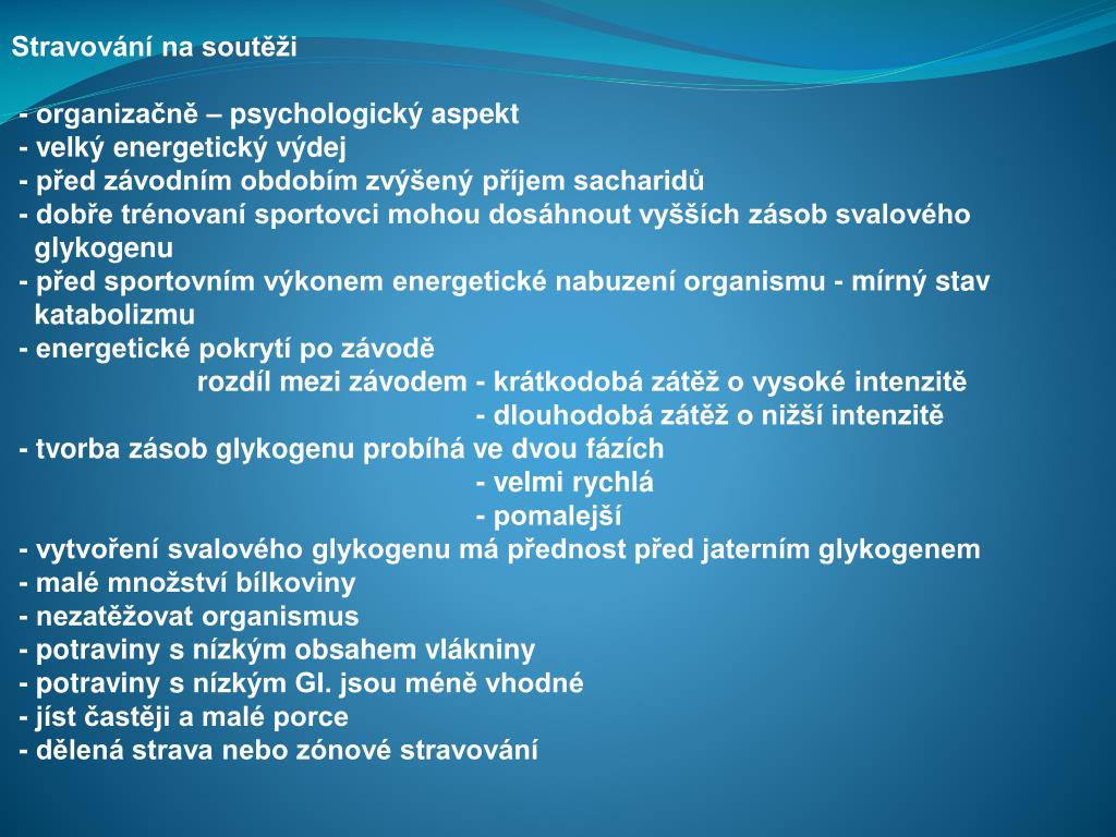 Stravování na soutěži • - organizačně – psychologický aspekt • - velký energetický výdej • - před závodním obdobím zvýšený příjem sacharidů • - dobře trénovaní sportovci mohou dosáhnout vyšších zásob svalového • glykogenu • - před sportovním výkonem energetické nabuzení organismu - mírný stav • katabolizmu • - energetické pokrytí po závodě • rozdíl mezi závodem - krátkodobá zátěž o vysoké intenzitě • - dlouhodobá zátěž o nižší intenzitě • - tvorba zásob glykogenu probíhá ve dvou fázích • - velmi rychlá • - pomalejší • - vytvoření svalového glykogenu má přednost před jaterním glykogenem • - malé množství bílkoviny • - nezatěžovat organismus • - potraviny s nízkým obsahem vlákniny • - potraviny s nízkým GI. jsou méně vhodné • - jíst častěji a malé porce • - dělená strava nebo zónové stravování