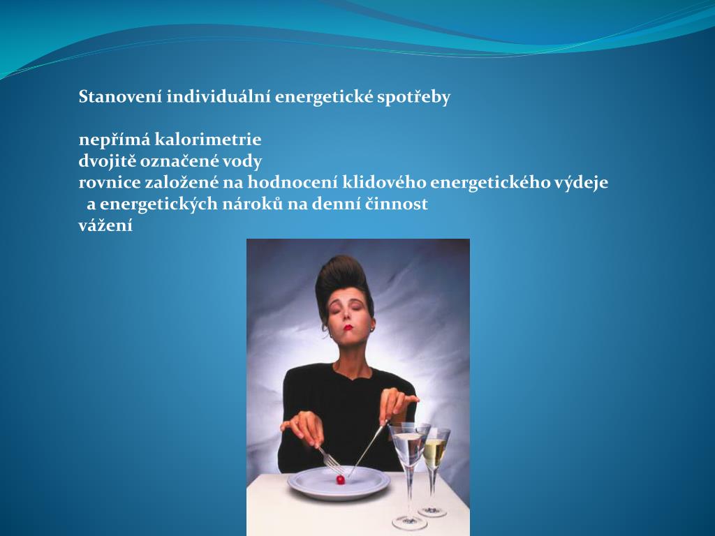 Stanovení individuální energetické spotřeby nepřímá kalorimetrie dvojitě označené vody rovnice založené na hodnocení klidového energetického výdeje a energetických nároků na denní činnost vážení