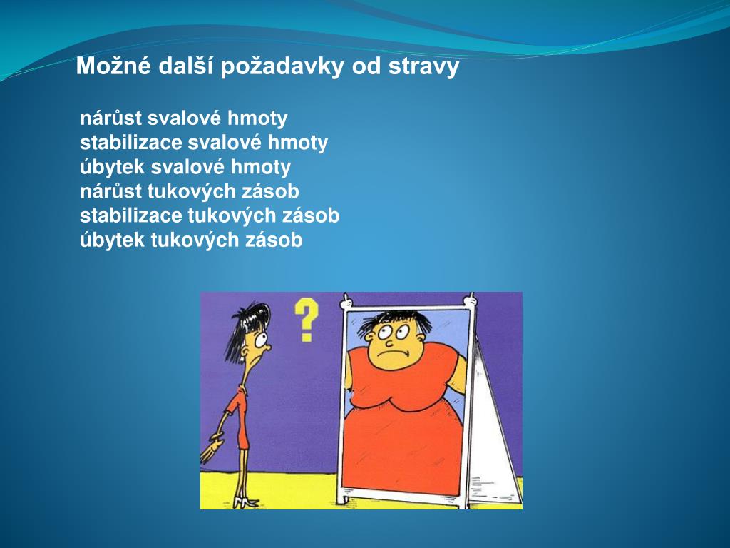 Možné další požadavky od stravy nárůst svalové hmoty stabilizace svalové hmoty úbytek svalové hmoty nárůst tukových zásob stabilizace tukových zásob úbytek tukových zásob