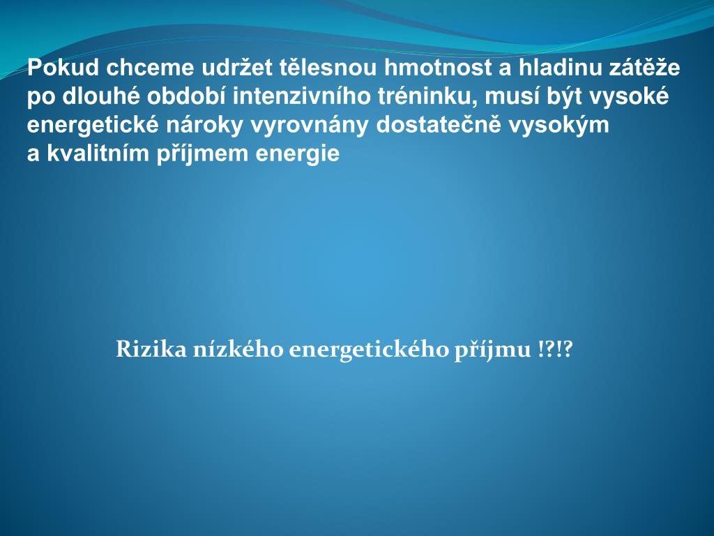 Pokud chceme udržet tělesnou hmotnost a hladinu zátěže po dlouhé období intenzivního tréninku, musí být vysoké energetické nároky vyrovnány dostatečně vysokým a kvalitním příjmem energie Rizika nízkého energetického příjmu !?!?