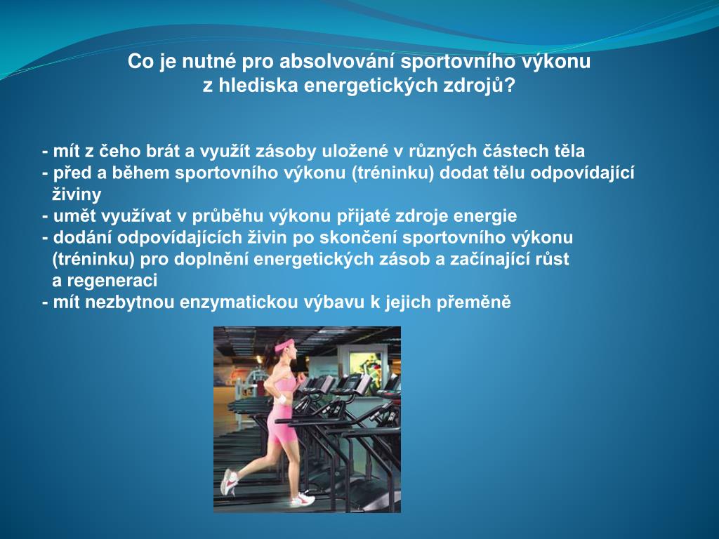 Co je nutné pro absolvování sportovního výkonu z hlediska energetických zdrojů? - mít z čeho brát a využít zásoby uložené v různých částech těla - před a během sportovního výkonu (tréninku) dodat tělu odpovídající živiny - umět využívat v průběhu výkonu přijaté zdroje energie - dodání odpovídajících živin po skončení sportovního výkonu (tréninku) pro doplnění energetických zásob a začínající růst a regeneraci - mít nezbytnou enzymatickou výbavu k jejich přeměně