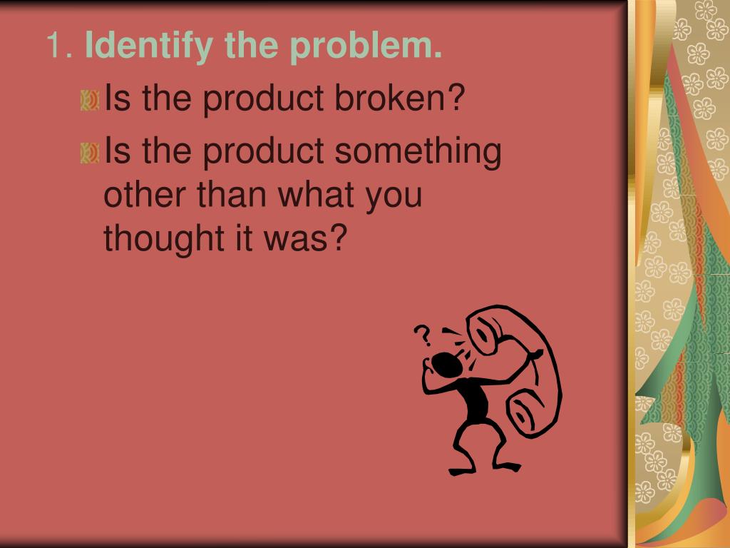 1. Identify the problem. • Is the product broken? • Is the product something other than what you thought it was?