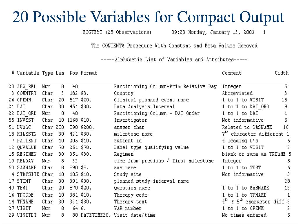 General ECGTEST Compact Report • Decide what variables to always exclude. • Decide constant variables for title. • Decide what 1 to 1 variables to include. • Count and remove applicable leading zeroes. • Determine which data condensing tricks work. • If not condensable, they must be output in full • Predetermine variables that need FLOW. • Determine which variables have a fixed width. • Calculate width of all remaining variables. • Use BY variables and the ID option for date.