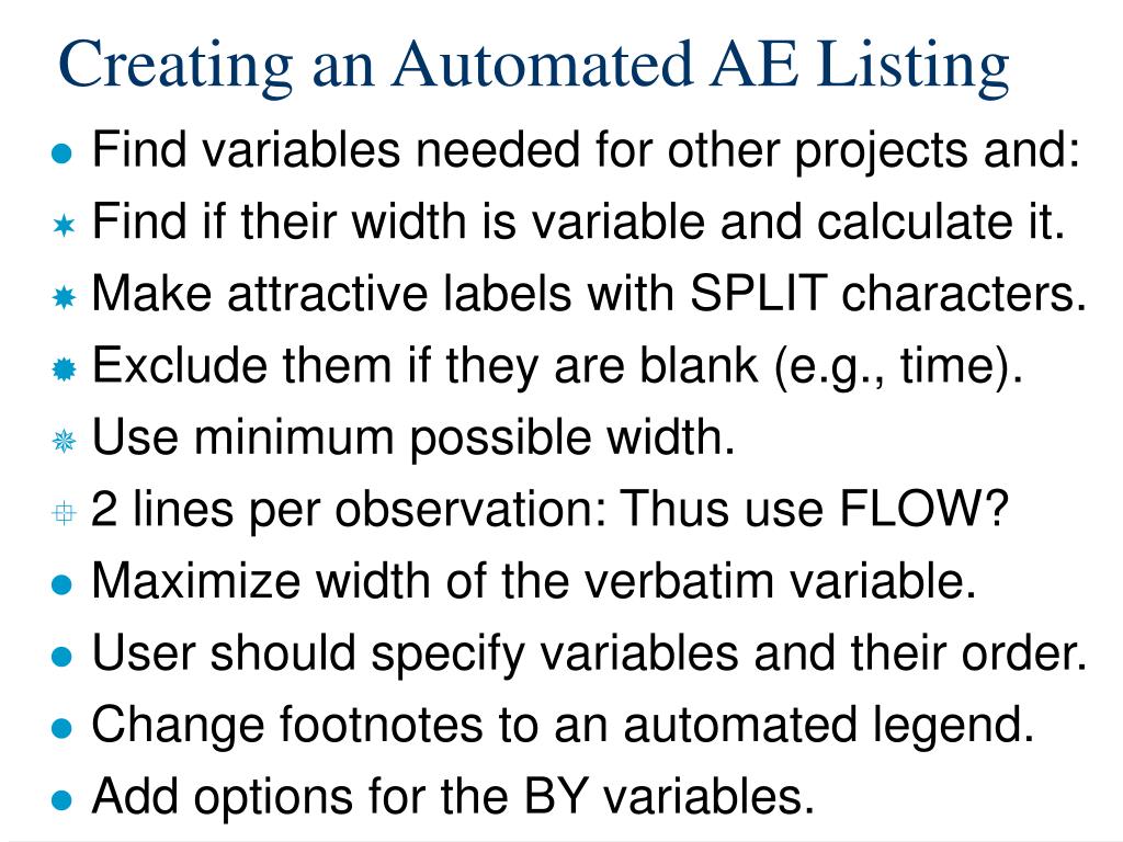 Creating an Automated AE Listing • Find variables needed for other projects and: • Find if their width is variable and calculate it. • Make attractive labels with SPLIT characters. • Exclude them if they are blank (e.g., time). • Use minimum possible width. • 2 lines per observation: Thus use FLOW? • Maximize width of the verbatim variable. • User should specify variables and their order. • Change footnotes to an automated legend. • Add options for the BY variables.