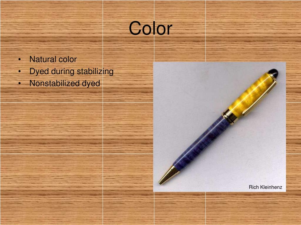 Color • Natural color • Dyed during stabilizing • Nonstabilized dyed • Stabilized and then dyed • Laminates • Resins Rich Kleinhenz