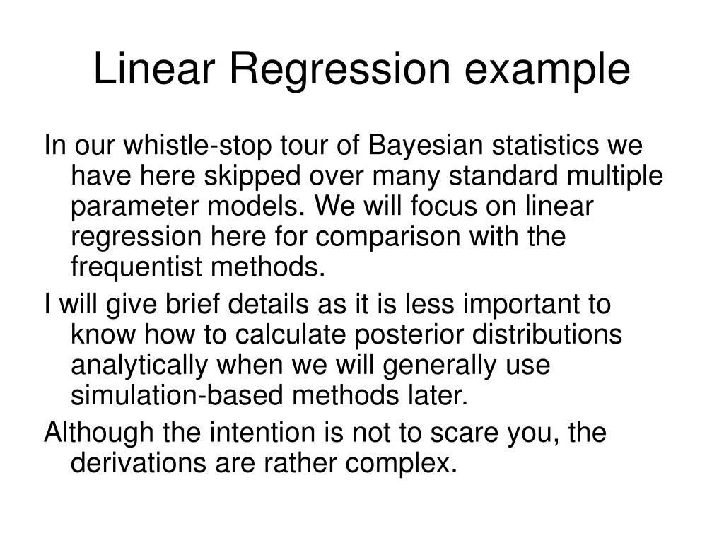 Linear Regression example In our whistle-stop tour of Bayesian statistics we have here skipped over many standard multiple parameter models. We will focus on linear regression here for comparison with the frequentist methods. I will give brief details as it is less important to know how to calculate posterior distributions analytically when we will generally use simulation-based methods later. Although the intention is not to scare you, the derivations are rather complex.