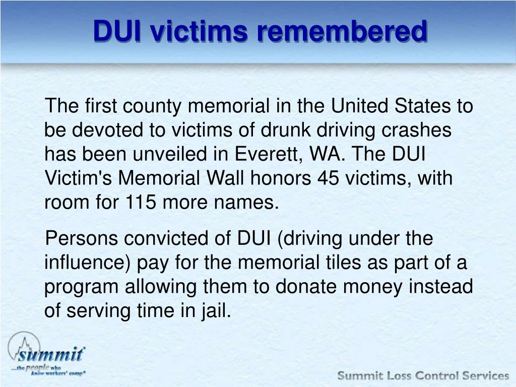 DUI victims remembered The first county memorial in the United States to be devoted to victims of drunk driving crashes has been unveiled in Everett, WA. The DUI Victim's Memorial Wall honors 45 victims, with room for 115 more names. Persons convicted of DUI (driving under the influence) pay for the memorial tiles as part of a program allowing them to donate money instead of serving time in jail.