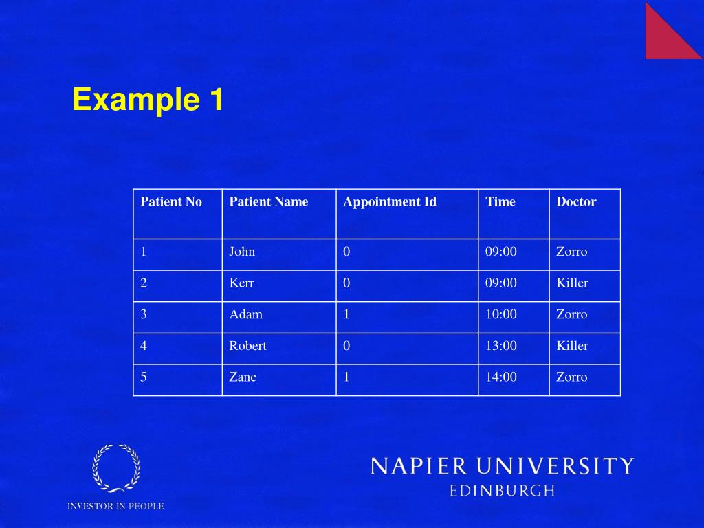 Two possible keys • DB(Patno,PatName,appNo,time,doctor) • Determinants: • Patno -> PatName • Patno,appNo -> Time,doctor • Time -> appNo • Two options for 1NF primary key selection: • DB(Patno,PatName,appNo,time,doctor) (example 1a) • DB(Patno,PatName,appNo,time,doctor) (example 1b)
