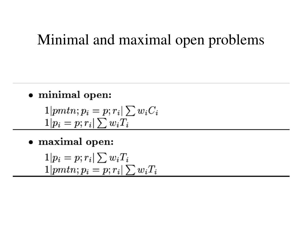 Examples • 1 | prec; pj = 1 | S wjCj • P2 | | Cmax • P | pj = 1; rj | S wjUj • R2 | chains; pmtn | Cmax • J3 | n = 3 | Cmax • F | pij = 1; outtree; rj | S Cj • Om | | pj = 1 | S Tj