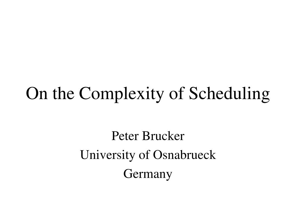 On the Complexity of Scheduling. Peter Brucker University of Osnabrueck Germany. 1.Scheduling Problems. In a scheduling problem one has to find time slots in which activities (or jobs) should be processed under given constraints. The main constraints are