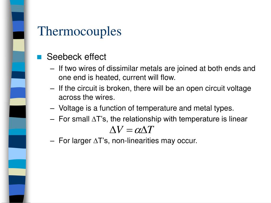 Thermocouples • Seebeck effect • If two wires of dissimilar metals are joined at both ends and one end is heated, current will flow. • If the circuit is broken, there will be an open circuit voltage across the wires. • Voltage is a function of temperature and metal types. • For small DT’s, the relationship with temperature is linear • For larger DT’s, non-linearities may occur.