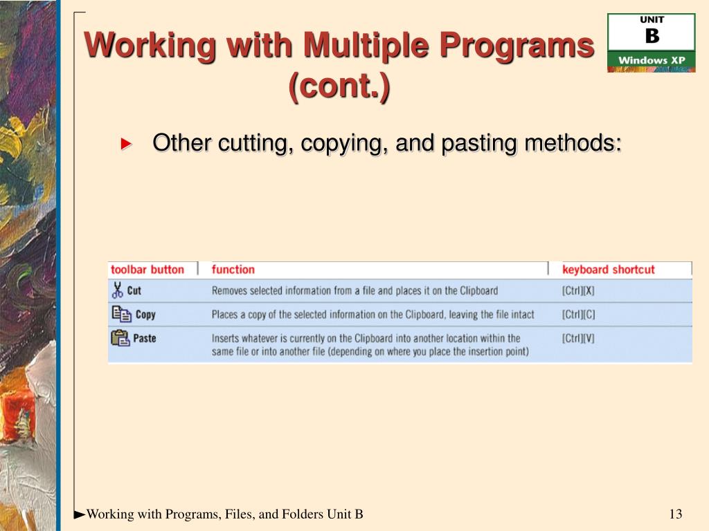 Working with Multiple Programs (cont.) • Other cutting, copying, and pasting methods: Working with Programs, Files, and Folders Unit B