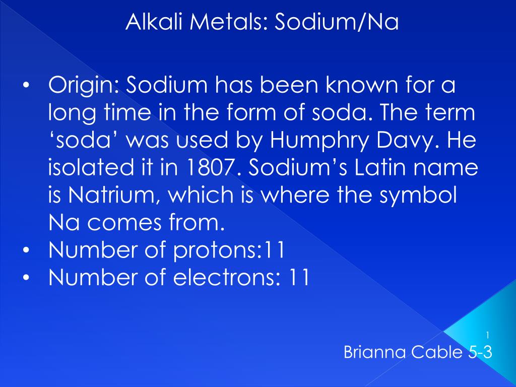 Alkali Metals: Sodium/Na . Origin: Sodium has been known for a long time in the form of soda. The term ‘soda’ was used by Humphry Davy. He isolated it in 1807. Sodium’s Latin name is Natrium, which is where the symbol Na comes from. Number of protons:11 Number of electrons: 11.