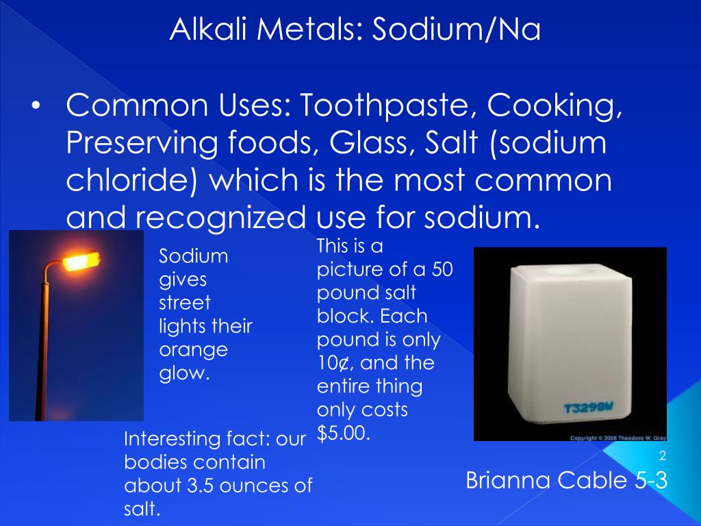 Alkali Metals: Sodium/Na • Common Uses: Toothpaste, Cooking, Preserving foods, Glass, Salt (sodium chloride) which is the most common and recognized use for sodium. This is a picture of a 50 pound salt block. Each pound is only 10¢, and the entire thing only costs $5.00. Sodium gives street lights their orange glow. Interesting fact: our bodies contain about 3.5 ounces of salt. Brianna Cable 5-3