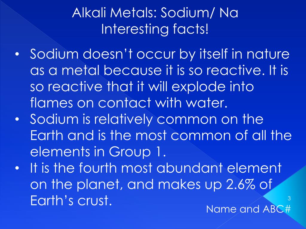 Alkali Metals: Sodium/ Na Interesting facts! • Sodium doesn’t occur by itself in nature as a metal because it is so reactive. It is so reactive that it will explode into flames on contact with water. • Sodium is relatively common on the Earth and is the most common of all the elements in Group 1. • It is the fourth most abundant element on the planet, and makes up 2.6% of Earth’s crust. Name and ABC#