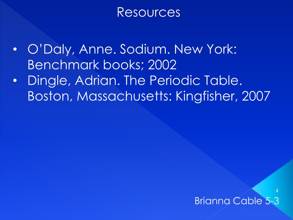 Resources • O’Daly, Anne. Sodium. New York: Benchmark books; 2002 • Dingle, Adrian. The Periodic Table. Boston, Massachusetts: Kingfisher, 2007 Brianna Cable 5-3