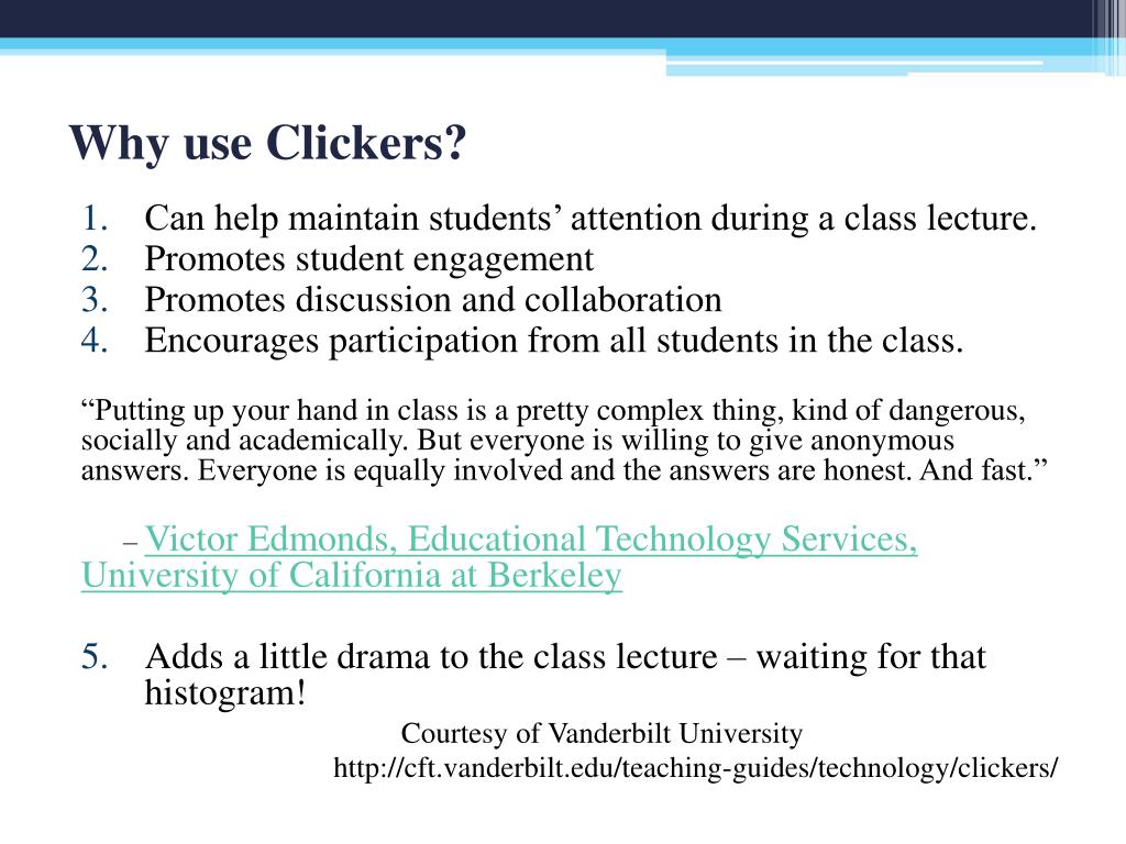 Why use Clickers? • Can help maintain students’ attention during a class lecture. • Promotes student engagement • Promotes discussion and collaboration • Encourages participation from all students in the class. “Putting up your hand in class is a pretty complex thing, kind of dangerous, socially and academically. But everyone is willing to give anonymous answers. Everyone is equally involved and the answers are honest. And fast.” – Victor Edmonds, Educational Technology Services, University of California at Berkeley • Adds a little drama to the class lecture – waiting for that histogram! Courtesy of Vanderbilt University http://cft.vanderbilt.edu/teaching-guides/technology/clickers/