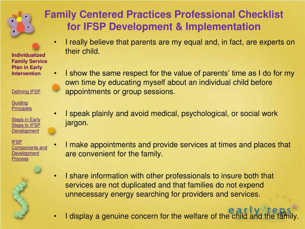 Family Centered Practices Professional Checklist for IFSP Development & Implementation I really believe that parents are my equal and, in fact, are experts on their child. I show the same respect for the value of parents’ time as I do for my own time by educating myself about an individual child before appointments or group sessions. I speak plainly and avoid medical, psychological, or social work jargon. I make appointments and provide services at times and places that are convenient for the family. I share information with other professionals to insure both that services are not duplicated and that families do not expend unnecessary energy searching for providers and services. I display a genuine concern for the welfare of the child and the family.