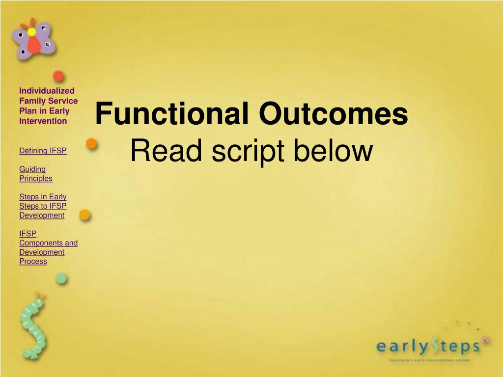 Learning Outcomes After completing this web-based training participants will: Describe the Individualized Family Service Plan Process in Early Intervention and the components of the IFSP Recognize and value the role and perspectives families have in the IFSP process Identify their role in the process, before, during, and after the plan has been developed. Identify strategies that will support family centered IFSP development Describe how family concerns, priorities, and resources are guiding factors in the development of IFSP outcomes