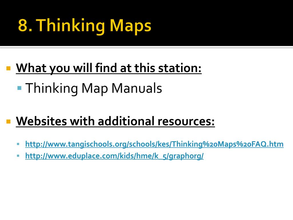 8. Thinking Maps • What you will find at this station: • Thinking Map Manuals • Websites with additional resources: • http://www.tangischools.org/schools/kes/Thinking%20Maps%20FAQ.htm • http://www.eduplace.com/kids/hme/k_5/graphorg/