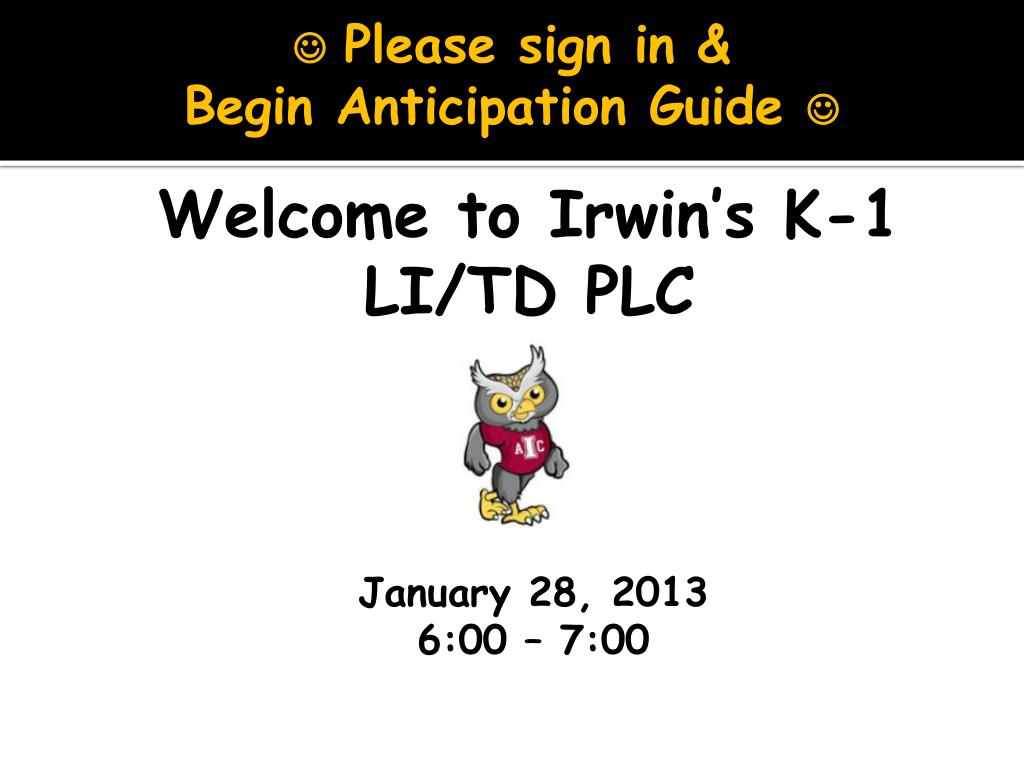 Please sign in & Begin Anticipation Guide Welcome to Irwin’s K-1 LI/TD PLC January 28, 2013 6:00 – 7:00