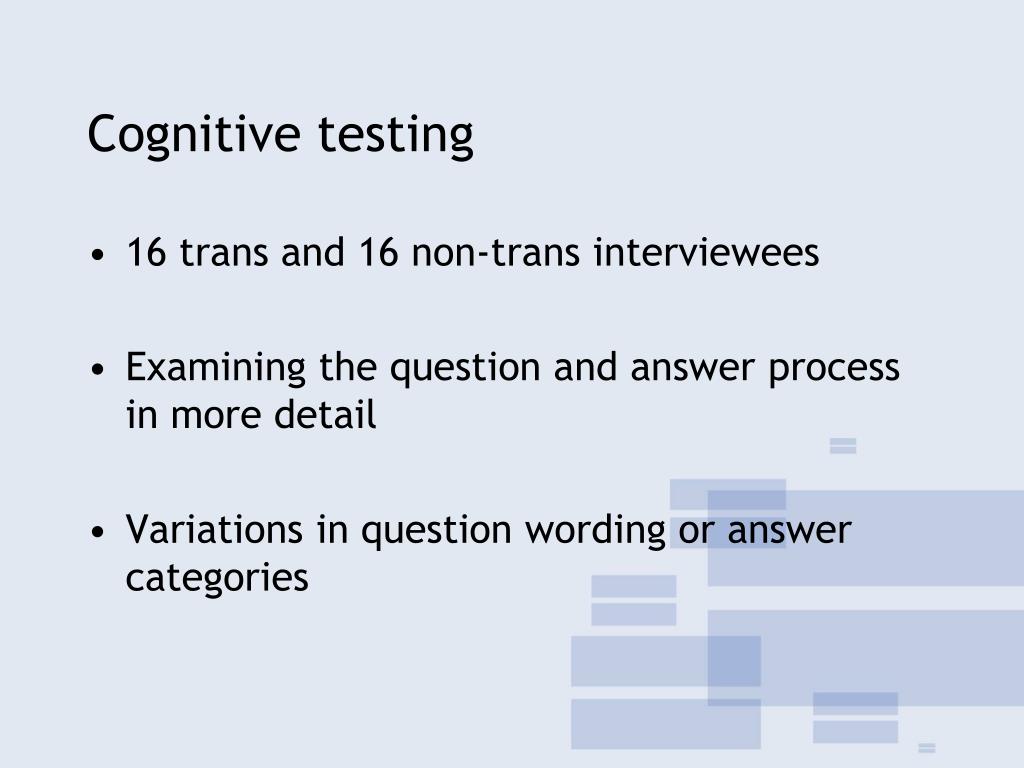 Cognitive testing • 16 trans and 16 non-trans interviewees • Examining the question and answer process in more detail • Variations in question wording or answer categories