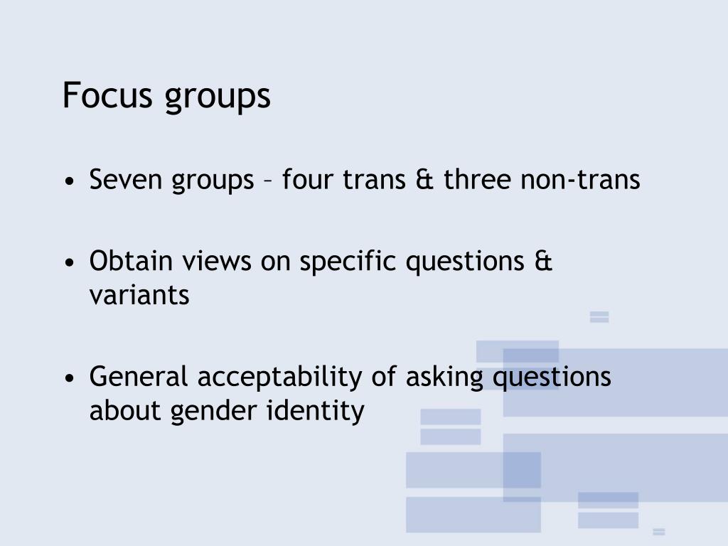Focus groups • Seven groups – four trans & three non-trans • Obtain views on specific questions & variants • General acceptability of asking questions about gender identity
