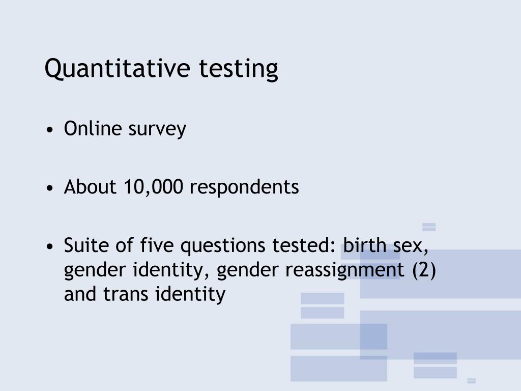 Quantitative testing • Online survey • About 10,000 respondents • Suite of five questions tested: birth sex, gender identity, gender reassignment (2) and trans identity