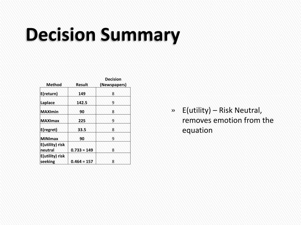 Decision Summary • E(utility) – Risk Neutral, removes emotion from the equation