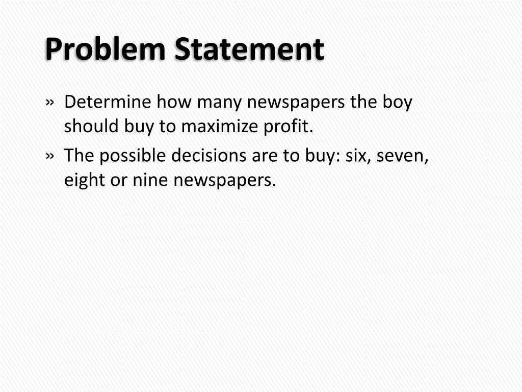 Problem Statement • Determine how many newspapers the boy should buy to maximize profit. • The possible decisions are to buy: six, seven, eight or nine newspapers.