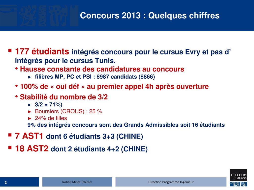 Recrutement 2013 quelques chiffres. 177 étudiants intégrés concours pour le cursus Evry et pas d’ intégrés pour le cursus Tunis. Hausse constante des candidatures au concours filières MP, PC et PSI : 8987 candidats (8866 ) 100% de « oui déf » au premier appel 4h après ouverture