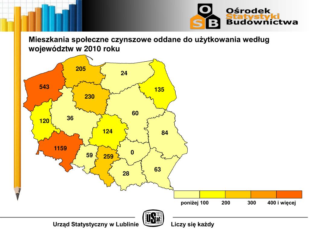 205 24 543 135 230 60 36 120 124 84 1159 0 59 259 63 28 Mieszkania społeczne czynszowe oddane do użytkowania według województw w 2010 roku poniżej 100 200 300 400 i więcej Urząd Statystyczny w Lublinie Liczy się każdy