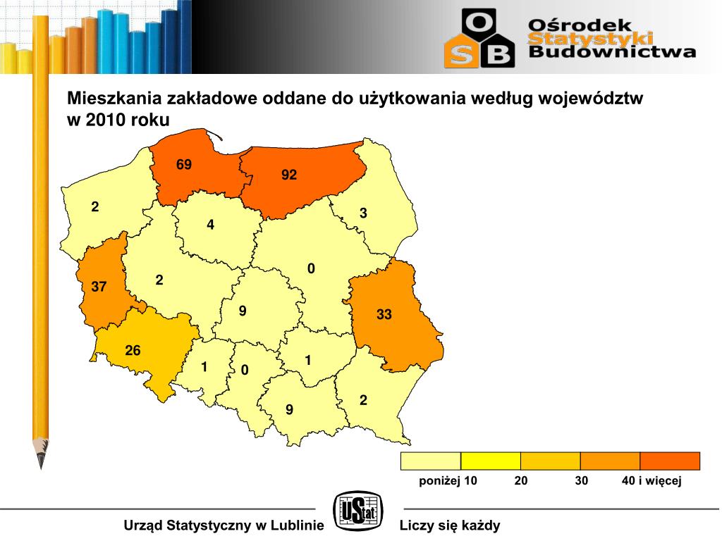 69 92 2 3 4 0 2 37 9 33 26 1 1 0 2 9 Mieszkania zakładowe oddane do użytkowania według województw w 2010 roku poniżej 10 20 30 40 i więcej Urząd Statystyczny w Lublinie Liczy się każdy