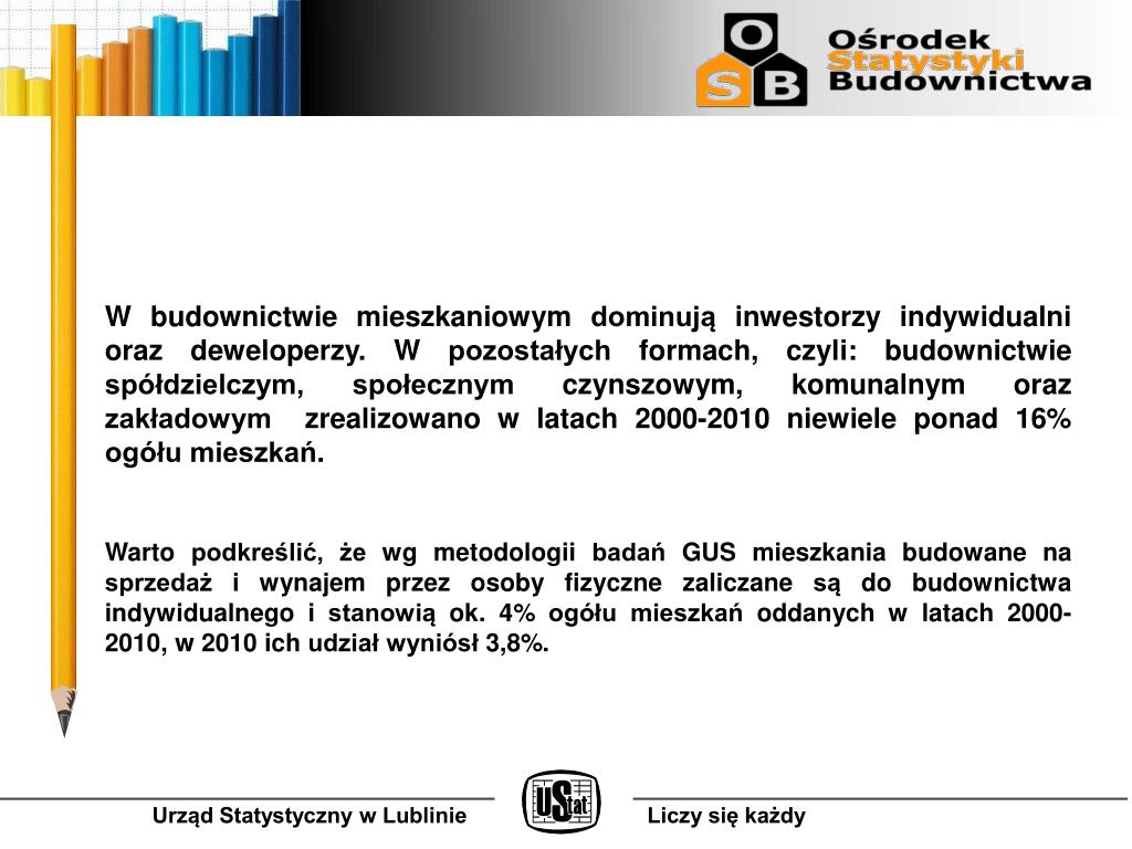 W budownictwie mieszkaniowym dominują inwestorzy indywidualni oraz deweloperzy. W pozostałych formach, czyli: budownictwie spółdzielczym, społecznym czynszowym, komunalnym oraz zakładowym zrealizowano w latach 2000-2010 niewiele ponad 16% ogółu mieszkań. Warto podkreślić, że wg metodologii badań GUS mieszkania budowane na sprzedaż i wynajem przez osoby fizyczne zaliczane są do budownictwa indywidualnego i stanowią ok. 4% ogółu mieszkań oddanych w latach 2000-2010, w 2010 ich udział wyniósł 3,8%. Urząd Statystyczny w Lublinie Liczy się każdy
