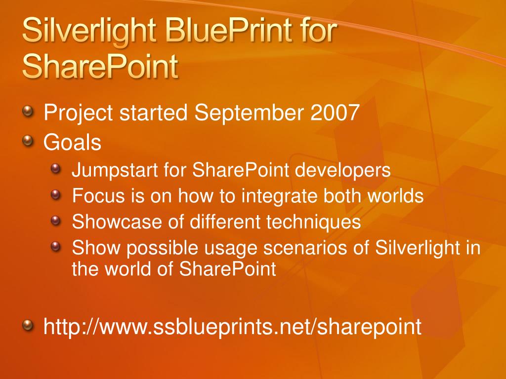 Silverlight BluePrint for SharePoint • Project started September 2007 • Goals • Jumpstart for SharePoint developers • Focus is on how to integrate both worlds • Showcase of different techniques • Show possible usage scenarios of Silverlight in the world of SharePoint • http://www.ssblueprints.net/sharepoint