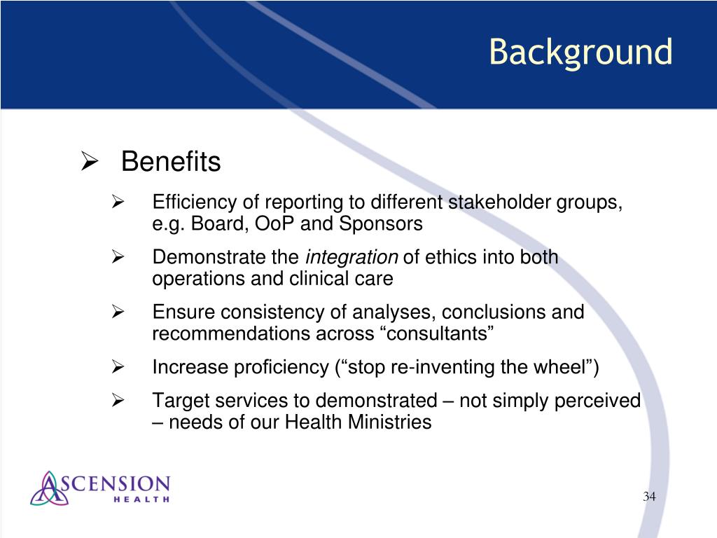 Background • Benefits • Efficiency of reporting to different stakeholder groups, e.g. Board, OoP and Sponsors • Demonstrate the integration of ethics into both operations and clinical care • Ensure consistency of analyses, conclusions and recommendations across “consultants” • Increase proficiency (“stop re-inventing the wheel”) • Target services to demonstrated – not simply perceived – needs of our Health Ministries