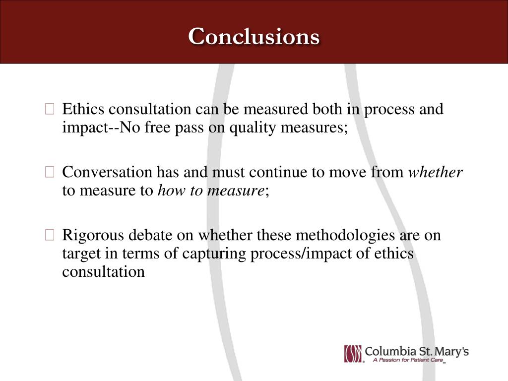 Conclusions • Ethics consultation can be measured both in process and impact--No free pass on quality measures; • Conversation has and must continue to move from whether to measure to how to measure; • Rigorous debate on whether these methodologies are on target in terms of capturing process/impact of ethics consultation